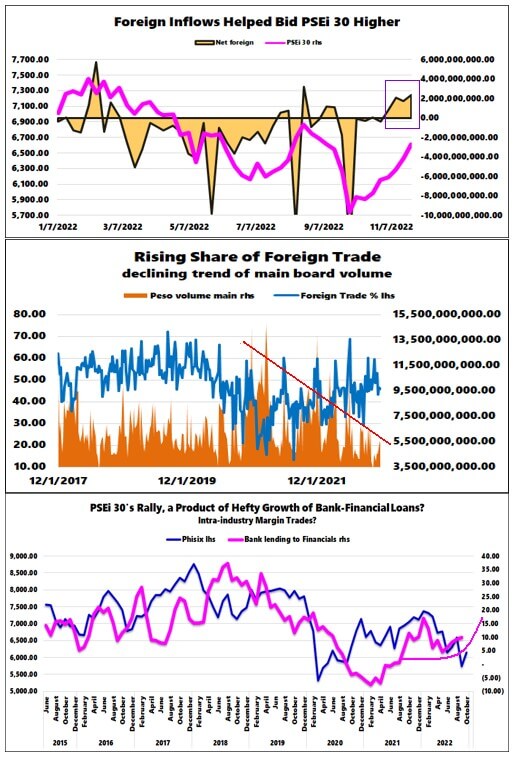 Besides, as noted above, despite the 15% rally, the main board and gross volume remain depressed. And the low turnover at the PSE can be traced to the diminishing bank liquidity in the banking system. (Figure 2, upper window)